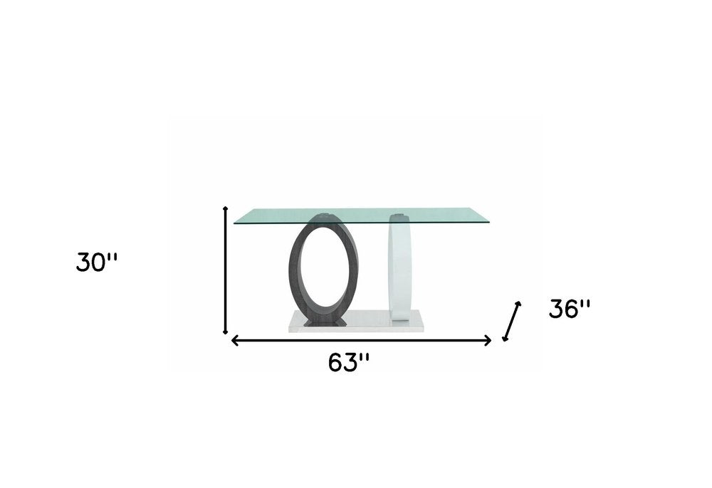 Give your room the perfect anchor piece with this 63-inch clear gray and white glass and metal double pedestal base dining table. Quality construction from the gray and white stainless steel and manufactured wood base combines with clear glass of the top to give this table a fresh and updated contemporary look. The unique double pedestal base design adds some dimension and elegance to your dining. Seat up to 6 family and friends around your new dining table. This design is a great way for you to enjoy dining and entertaining in style. 30-inch h x 63-inch w x 36-inch d.